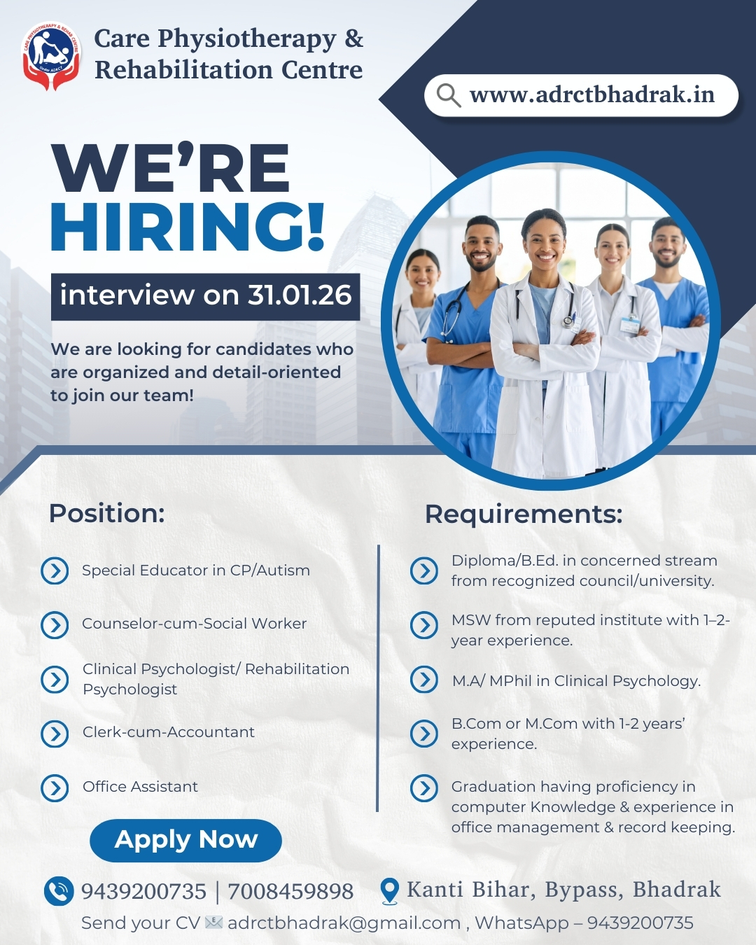 If you are dedicated, compassionate, and ready to join a leading rehabilitation team, we would love to hear from you.